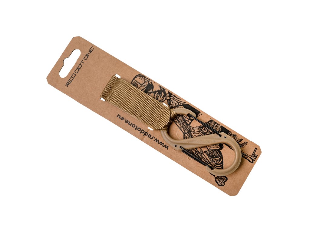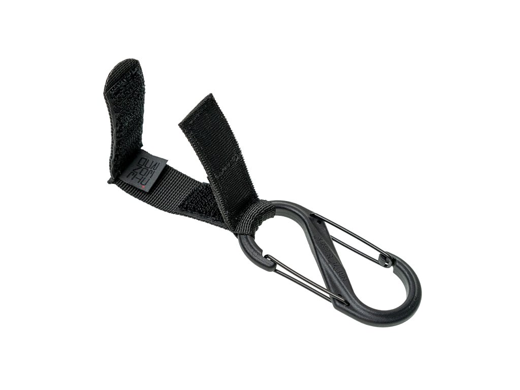 La correa permite fijar el mosquetón a un cinturón, un sistema MOLLE o una mochila. La presilla para cinturón cuenta con un panel interno de velcro para adaptarse a diferentes anchos de cinturón.
