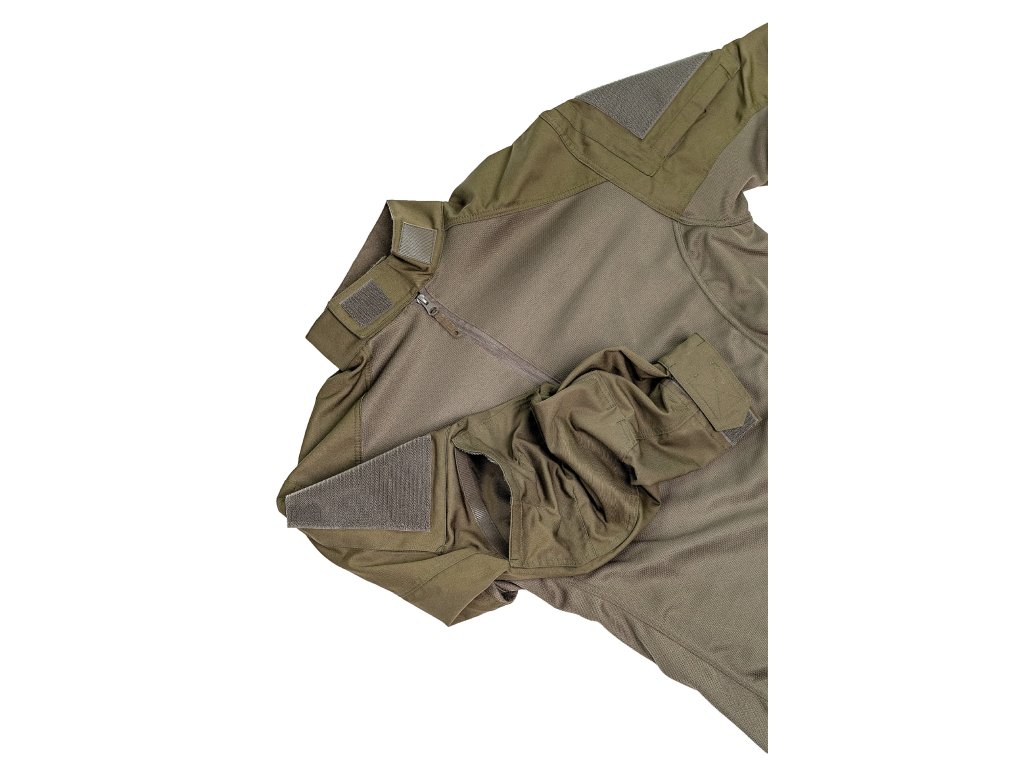 Las mangas y los hombros están confeccionados con el mismo material resistente utilizado en los uniformes de combate ALPHA, proporcionando una elevada resistencia mecánica y protección en las zonas expuestas. Las mangas incorporan bolsillos funcionales y detalles habituales en las camisas de combate estándar.