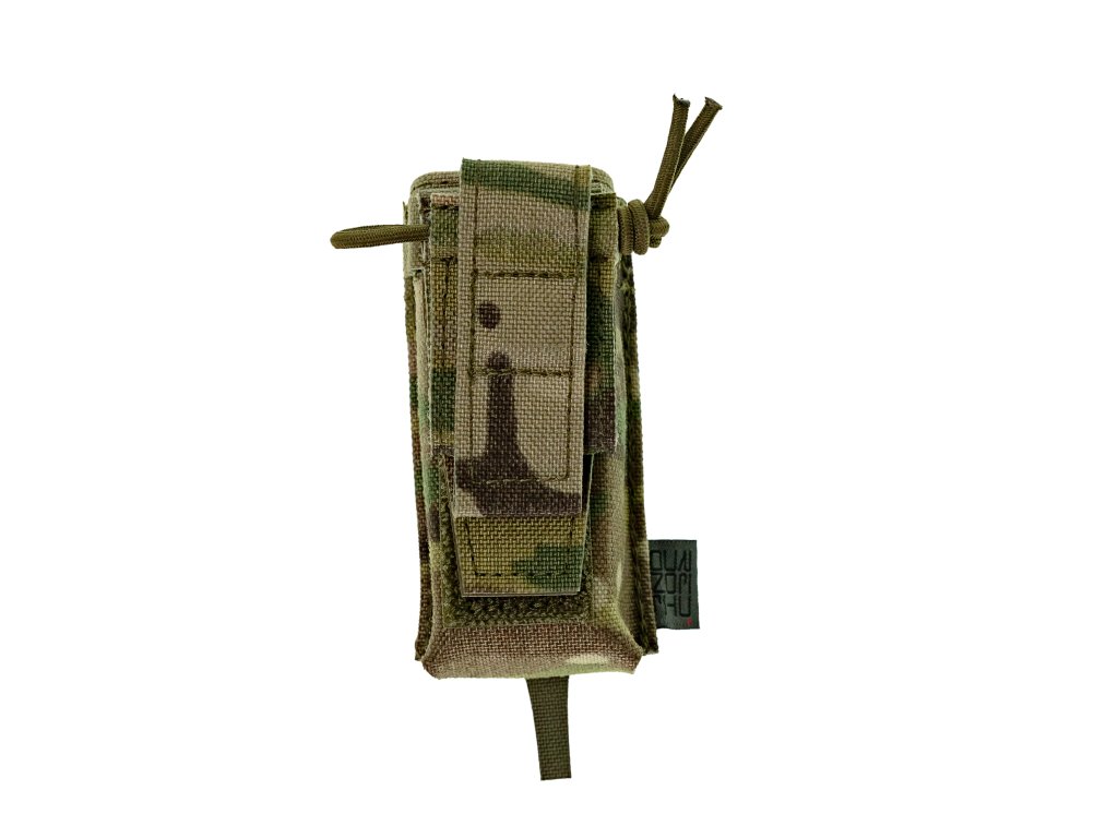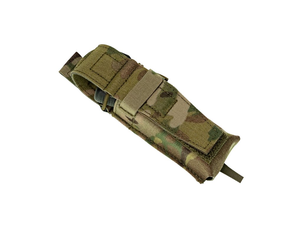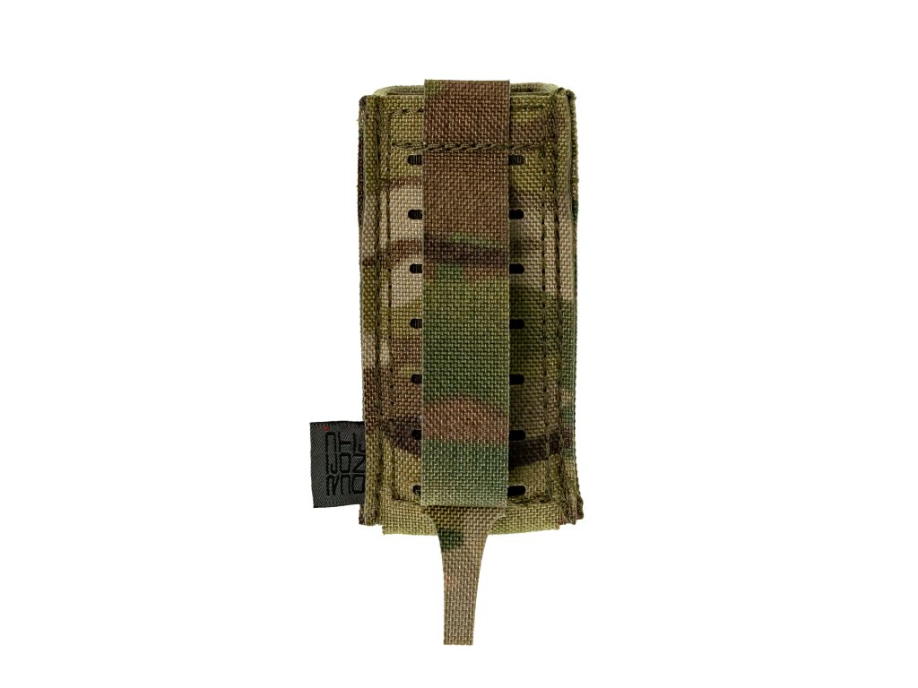 La funda también cuenta con una solapa flexible extraíble que se desliza de adelante hacia atrás. Esta solapa actúa como sistema de bloqueo, fijando el cargador en la funda y protegiéndolo de posibles daños mecánicos durante el arrastre y otras actividades que puedan ocurrir en combate, donde la parte inferior del cargador sufre una gran presión.