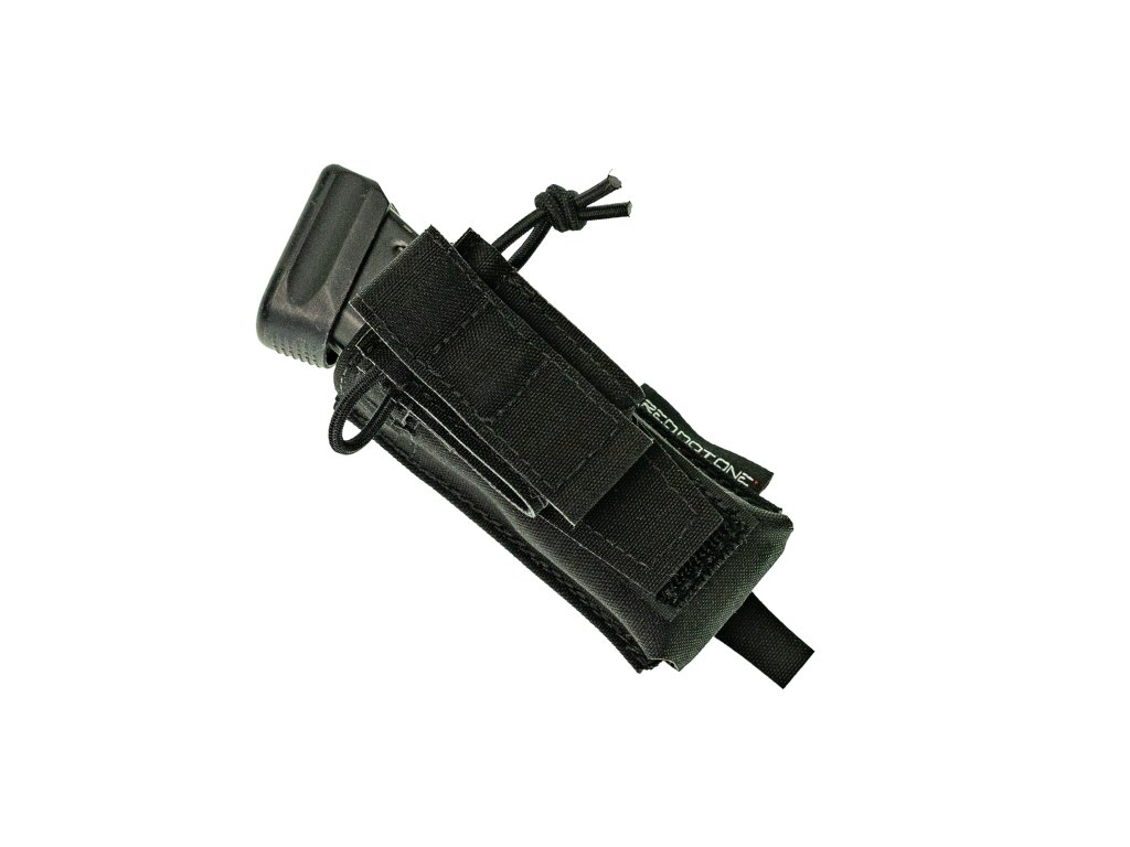 La funda también cuenta con una solapa flexible extraíble que se desliza de adelante hacia atrás. Esta solapa actúa como sistema de bloqueo, fijando el cargador en la funda y protegiéndolo de posibles daños mecánicos durante el arrastre y otras actividades que puedan ocurrir en combate, donde la parte inferior del cargador sufre una gran presión.